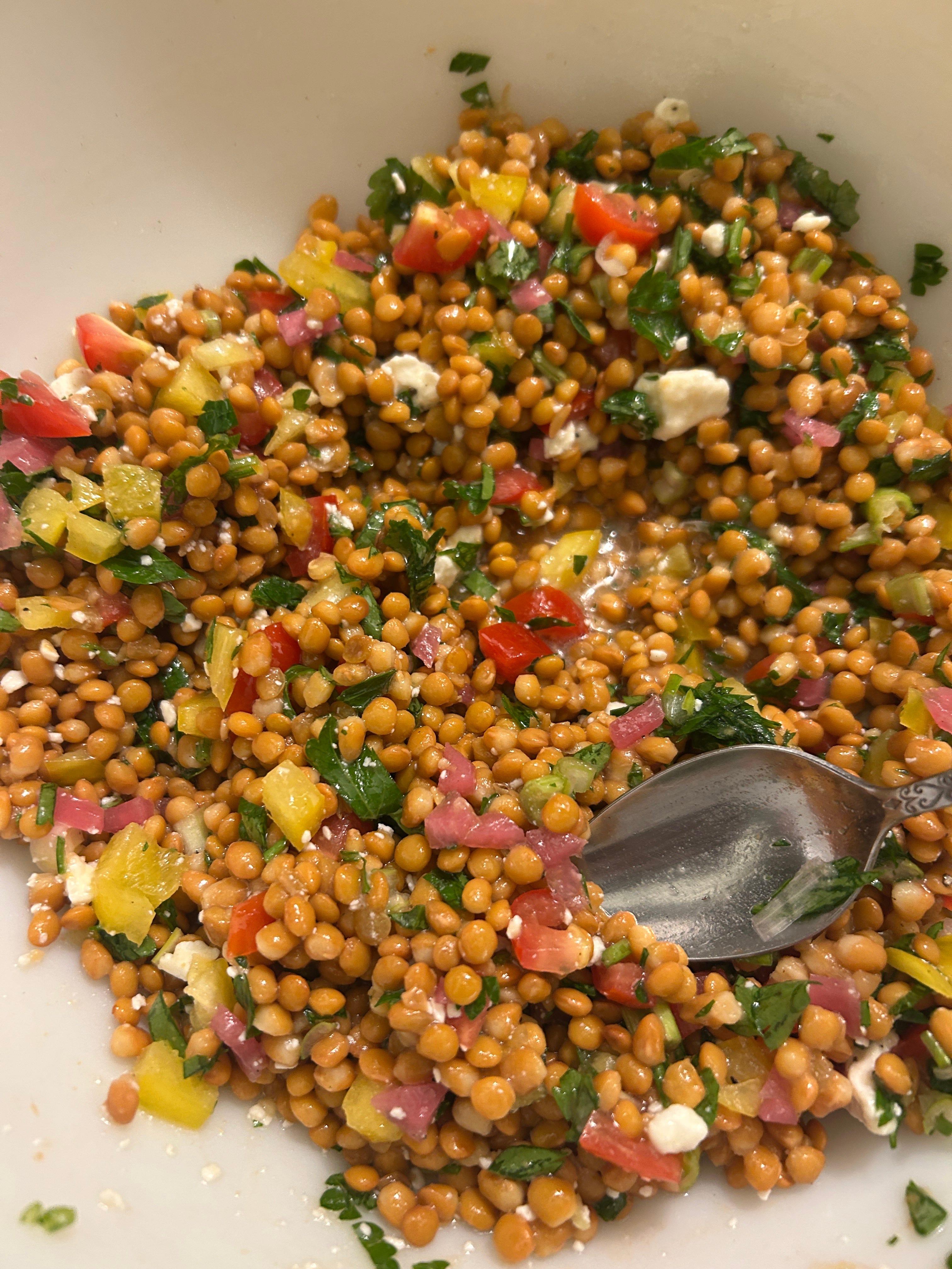 The perfect lentil salad with feta, pickled red onions (shocker), feta, tomatoes, parsley, yellow pepper, pickled onion vinegar, olive oil and salt/pepper!