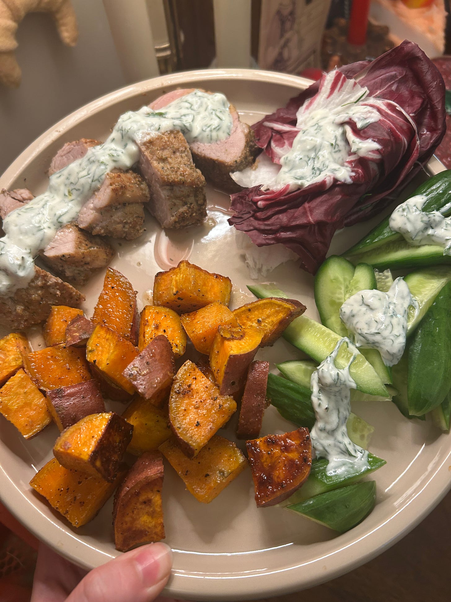 Roasted pork tenderloin, sweet potatoes with radicchio and cucumbers along with a dill yogurt sauce. Lovely!