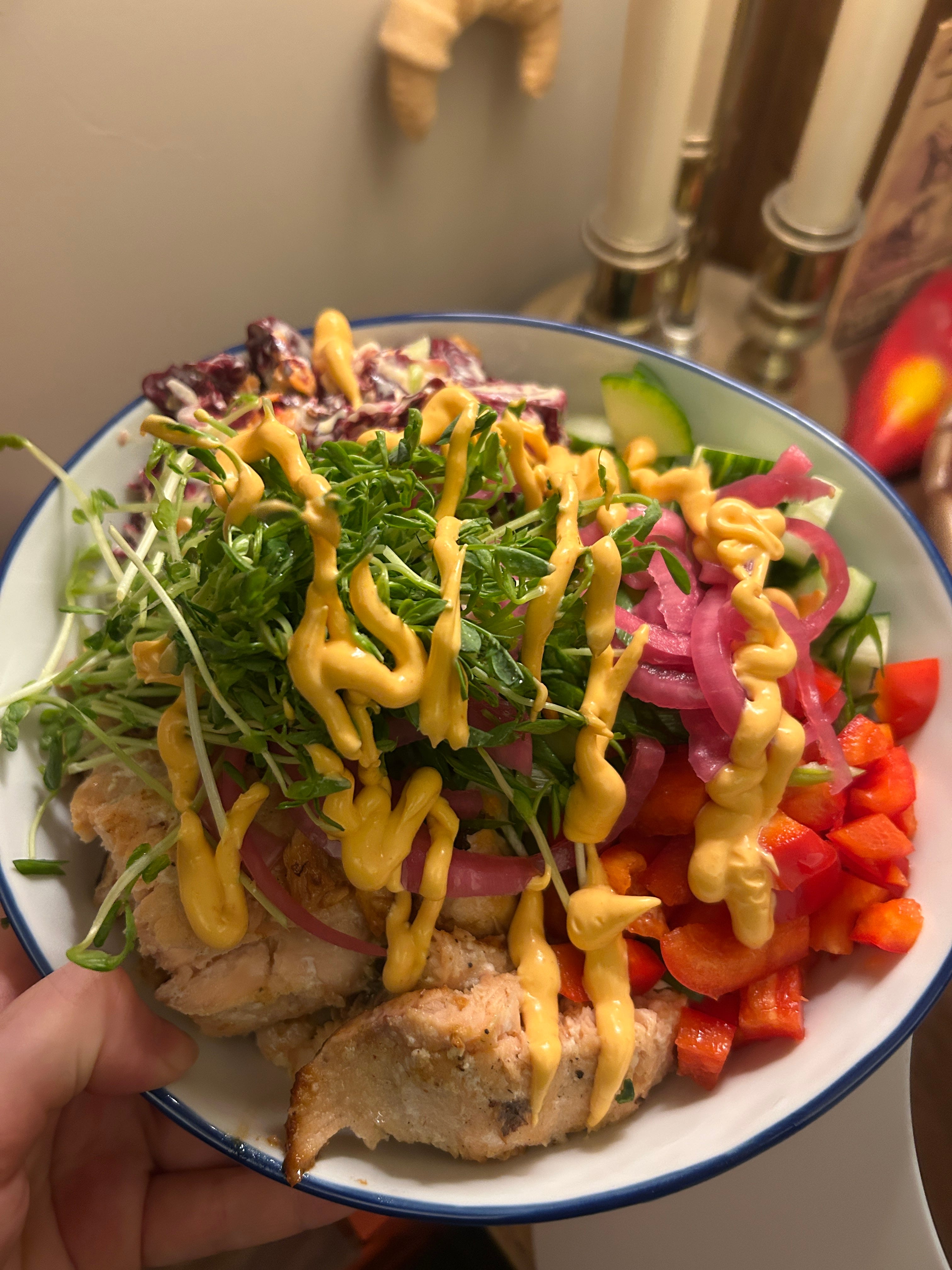 A true reset meal with rice, peppers, cucumber, pea shoots, salmon, radicchio slaw, pickled red onions, and sriracha mayo!