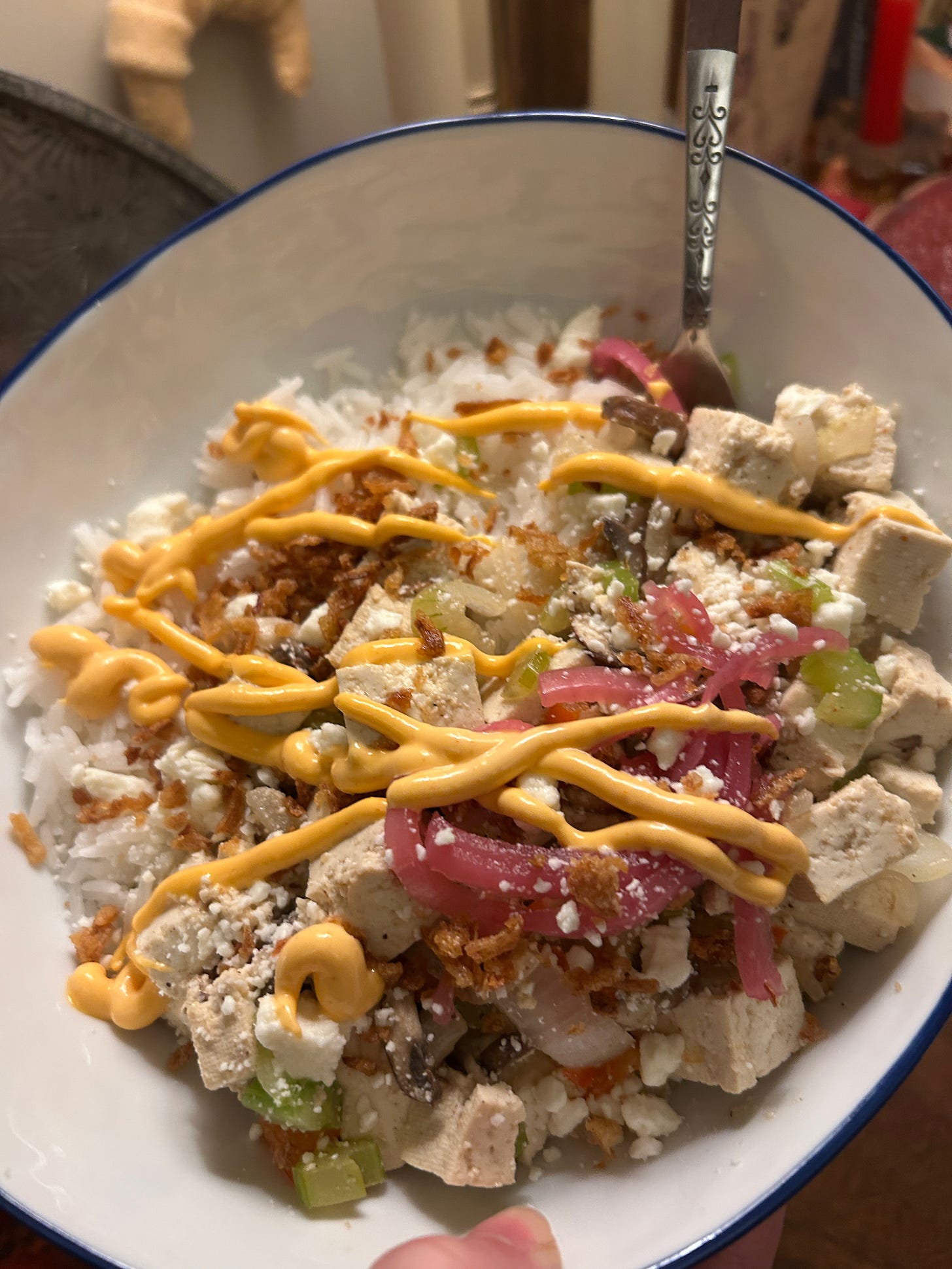 Shocklingly good! I had 15 minutes to put this together. Rice, stir fried firm tofu and veg with pickled red onions, crispy fried onions and sriracha mayo! So good!