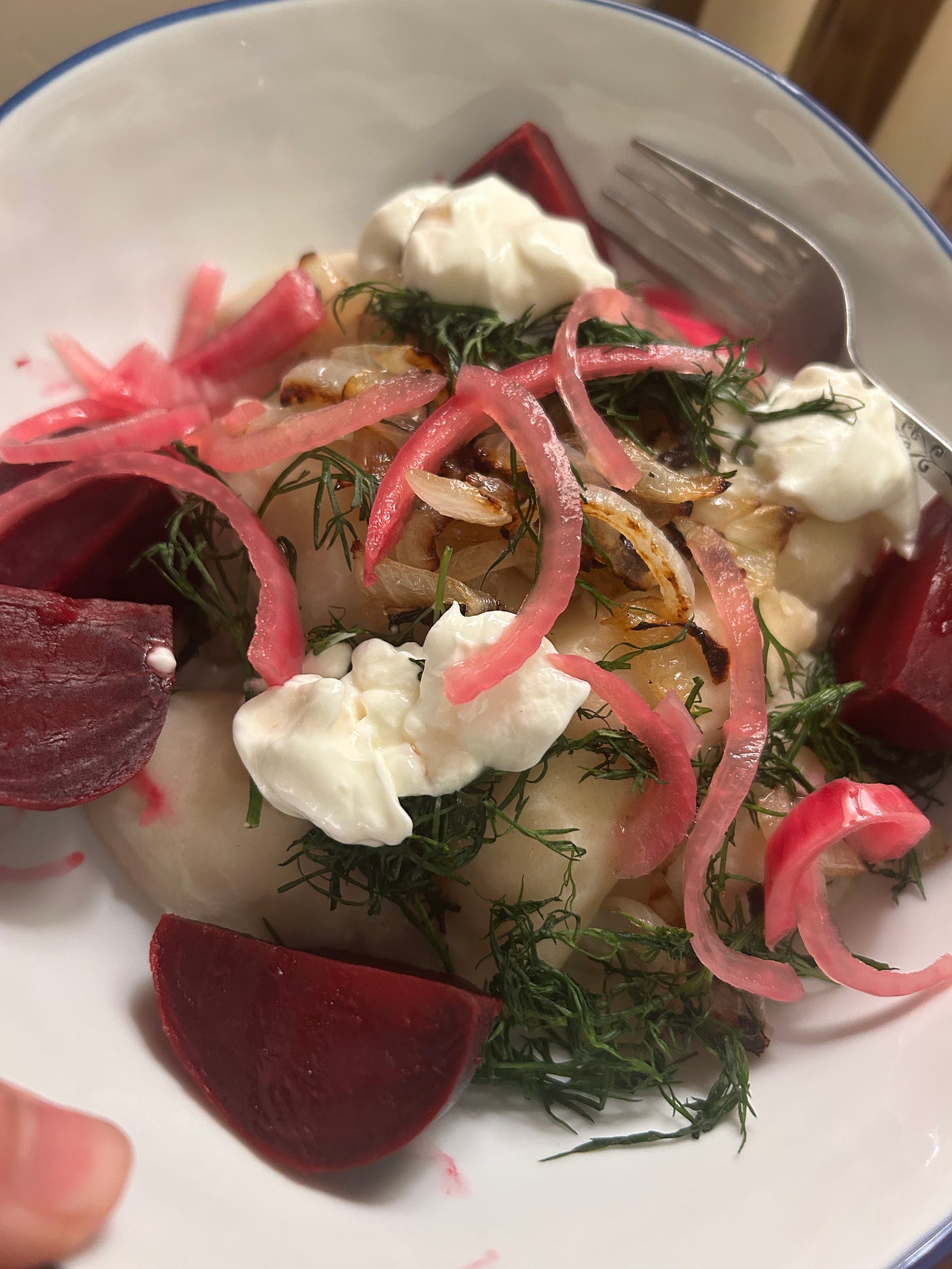 Pierogi, beets, dill, sautéed onions, pickled red onions, sour cream and cottage cheese. In my Polish era hehe.