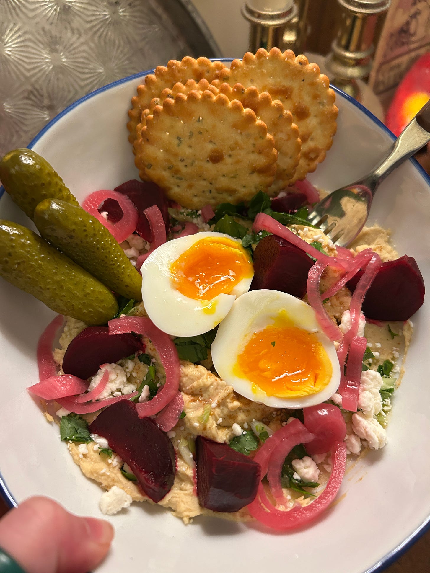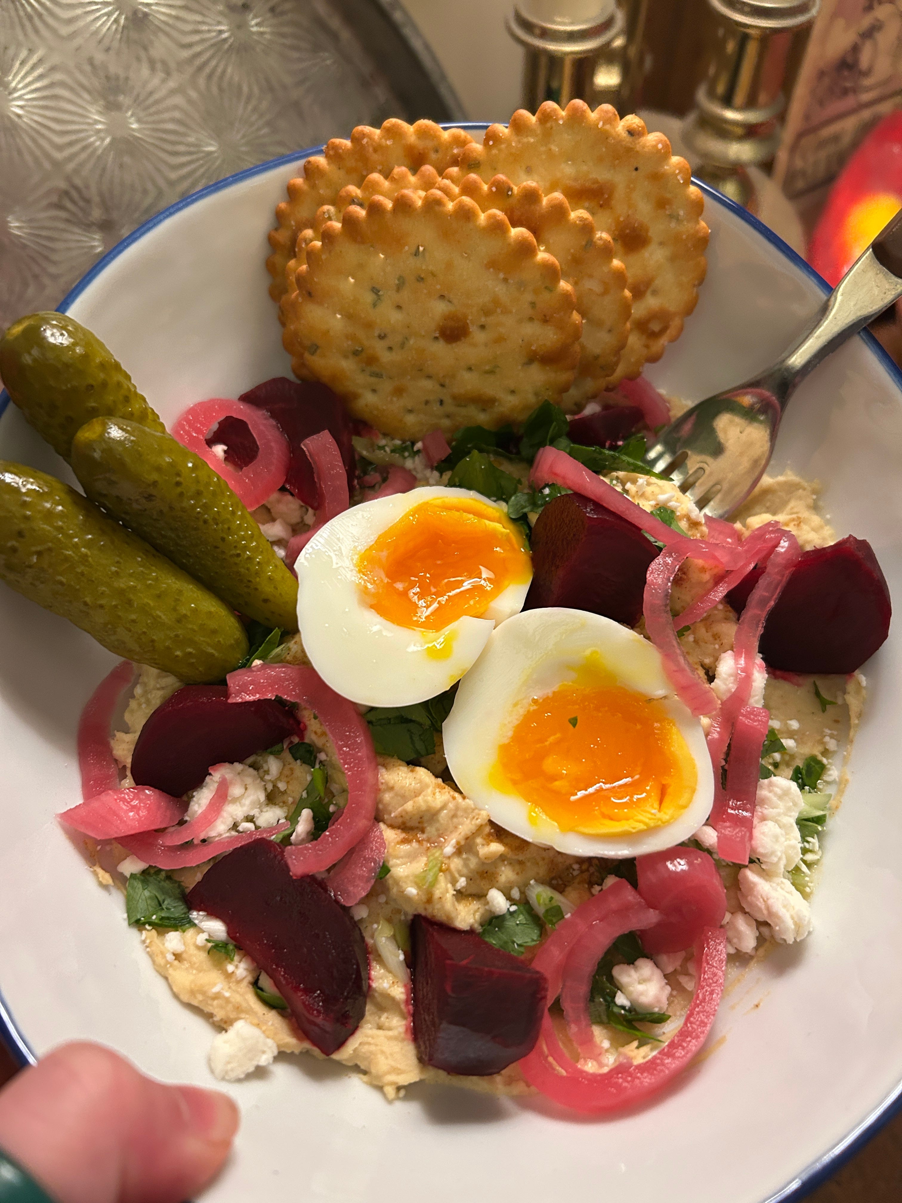 Hummus bowl! Beets, pickles, pickled red onions, parsley, feta and a jammy egg! I love making a whole meal from scratch and it being super yummy!