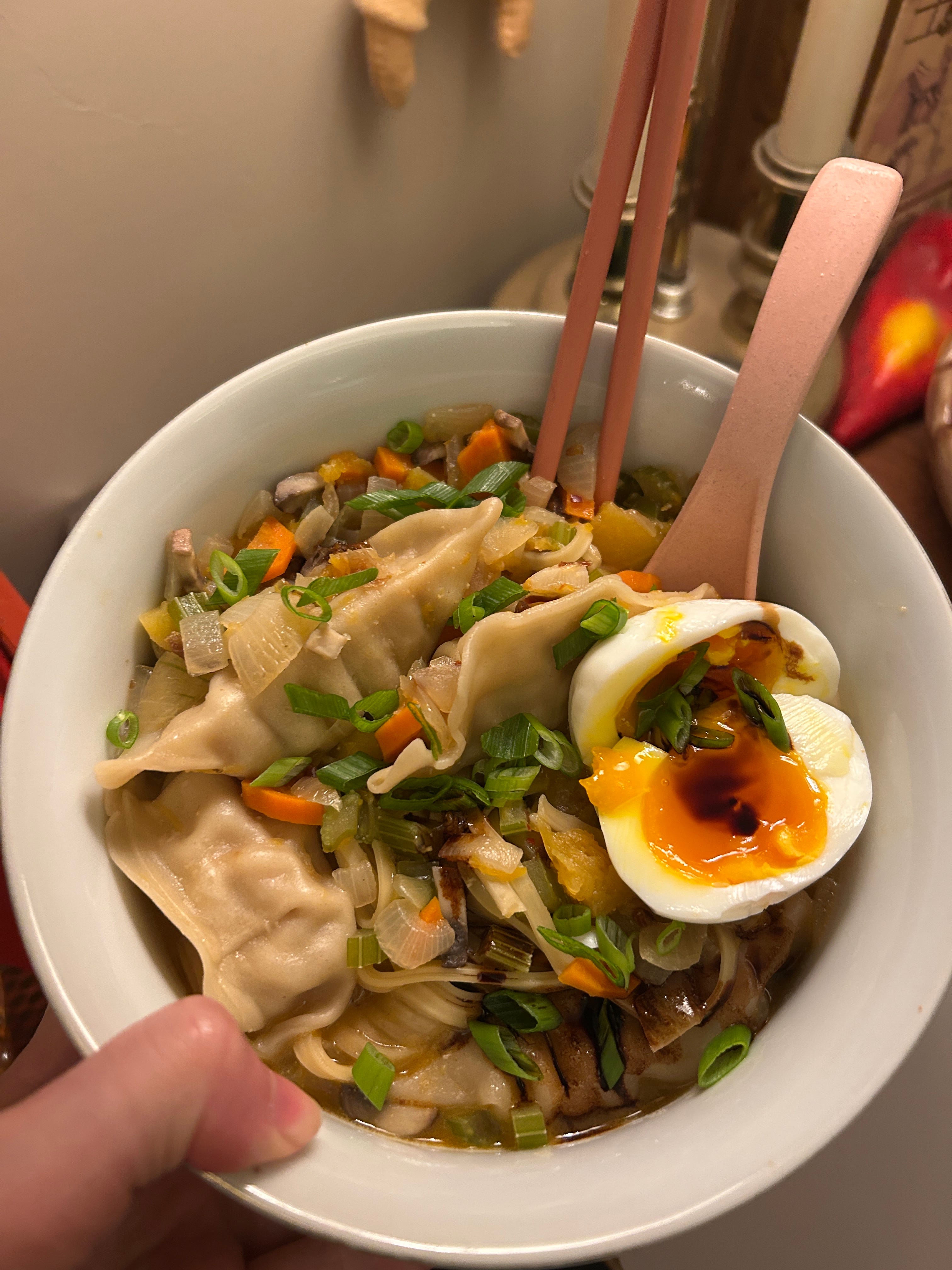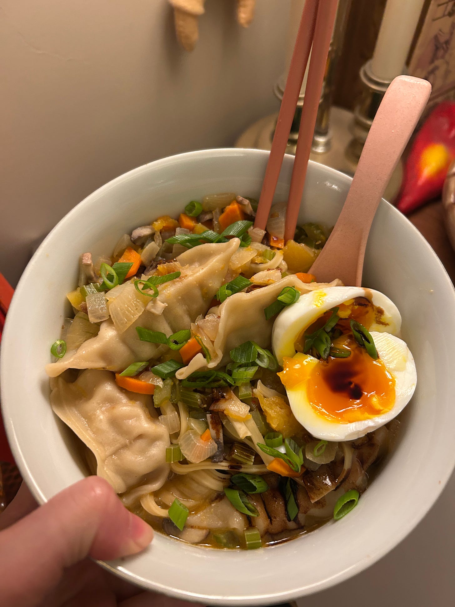 Dumpling Chicken Miso Broth Ramen with a Jammy Egg! Sooooo cozy!
