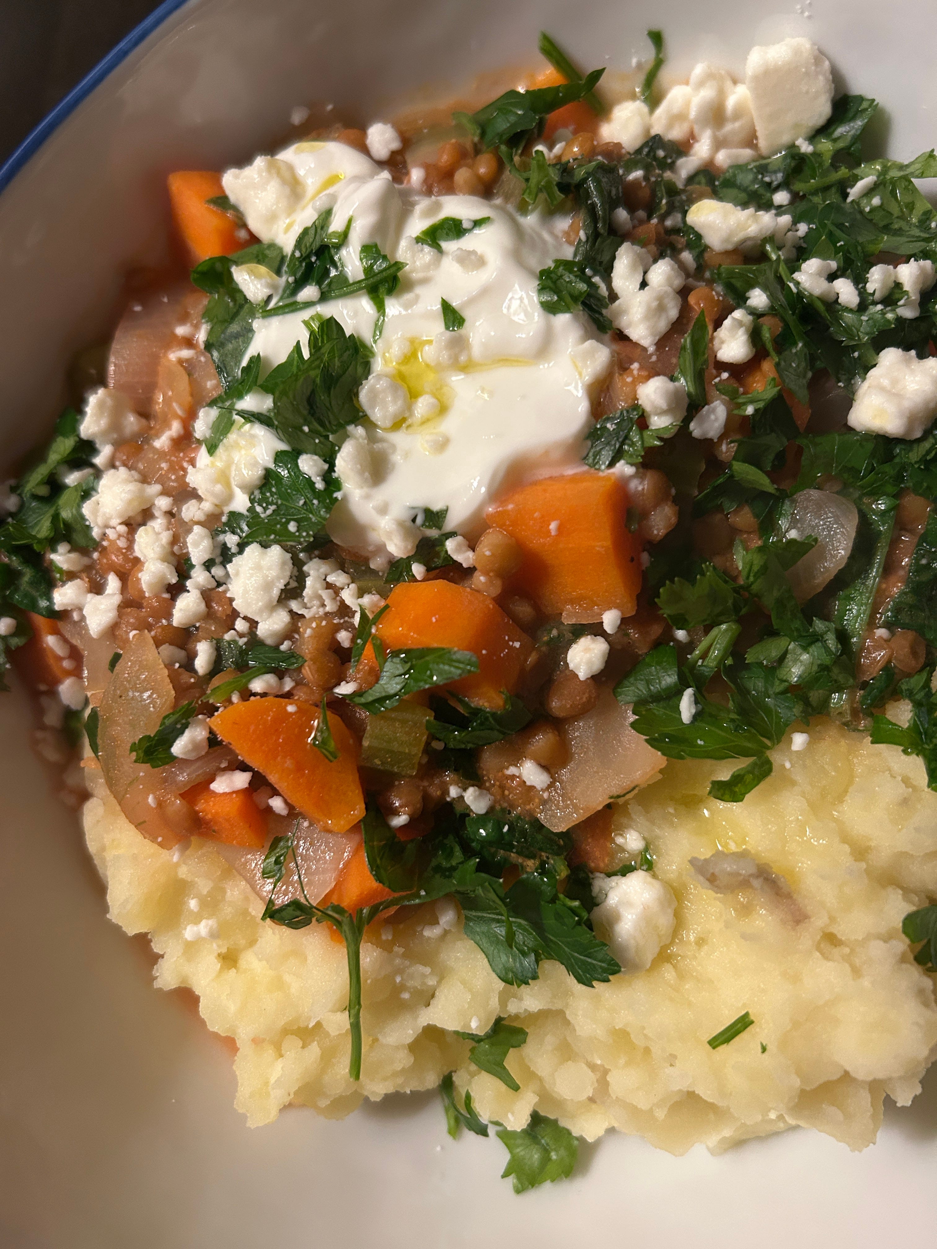 Mashed potatoes, lentil stew, sour cream, parsley and feta! Made way too much of this, but it was very nice.