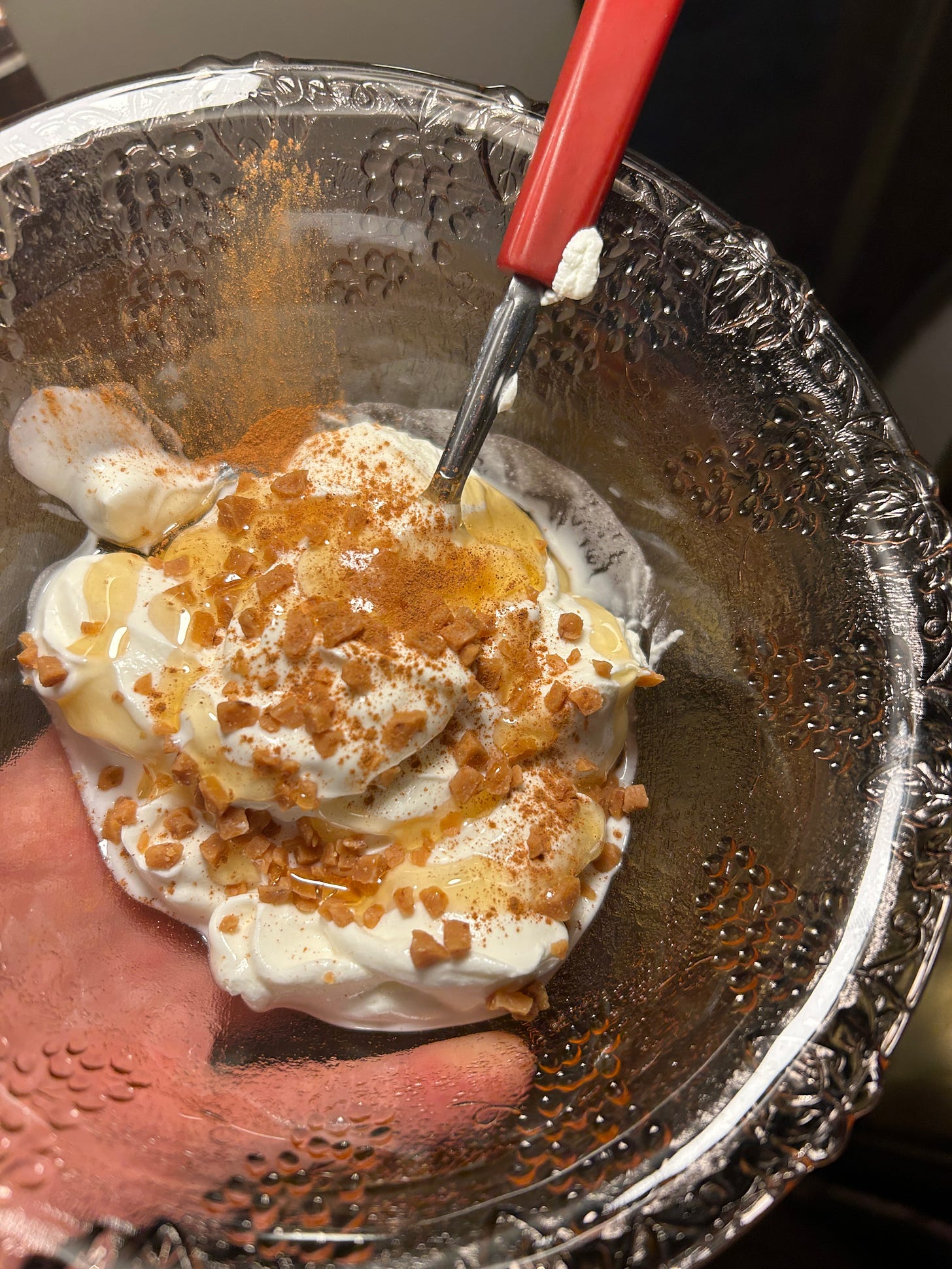 Greek yogurt with skor bits, honey and cinnamon. Honestly a very good dessert!