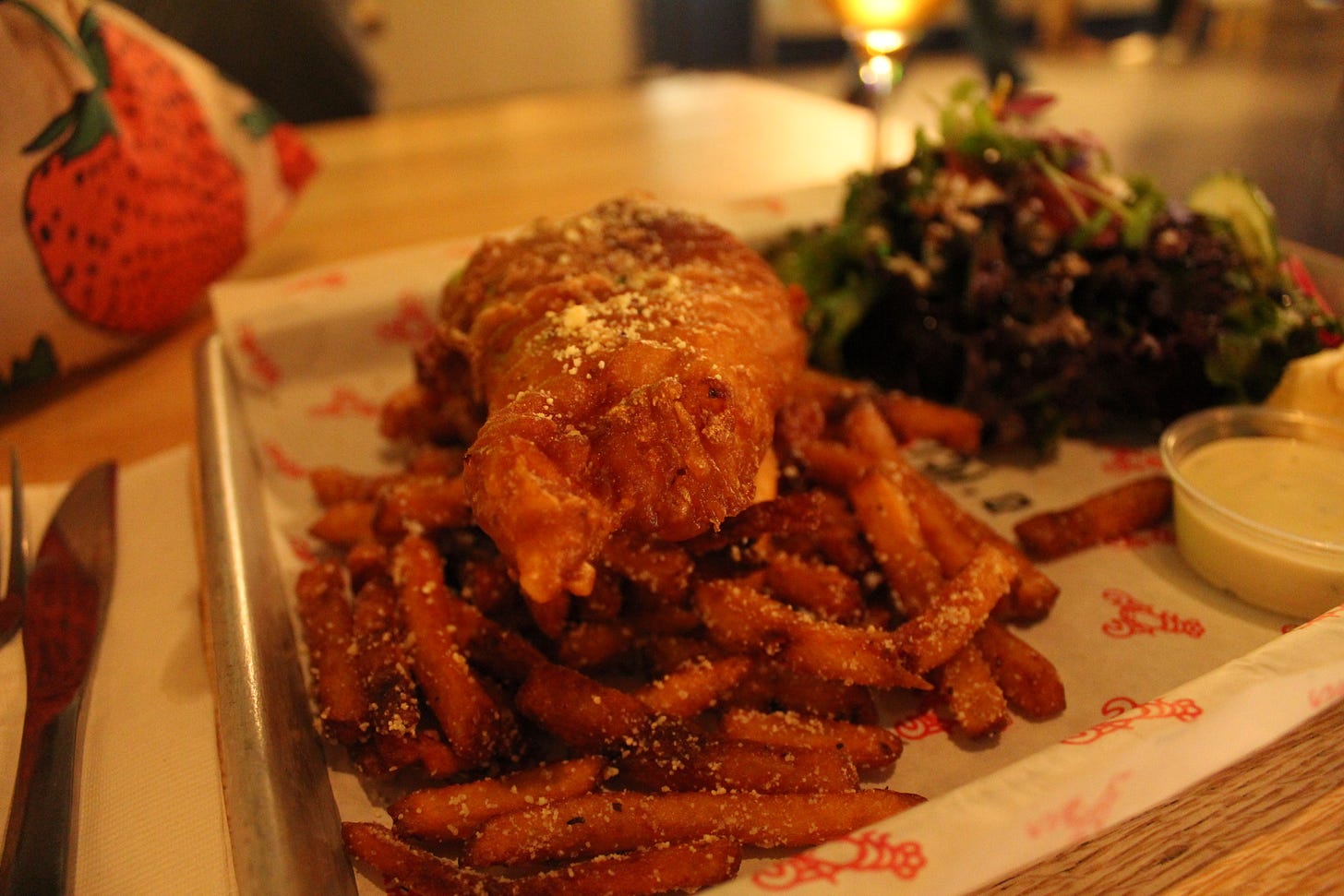 Gaspésie Camion Gourmand in Le Central. GORGEOUS Fish and Chips, yet somehow the salad was the true star. so lovely, perfectly dressed, DELIGHTFUL!