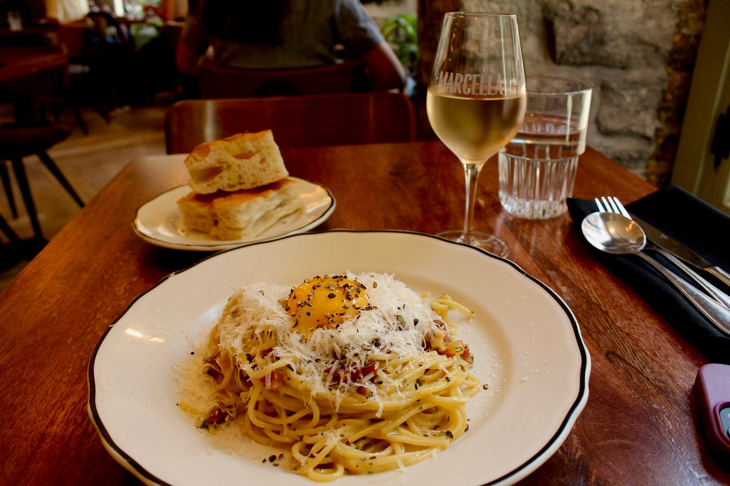 Dinette Marcella. To be honest the vibes were really nice here, and I’ve enjoyed other dishes before, but the pepper was way too coarse and the carbonara too salty. Still pretty good, but maybe order it with a salad to cut the richness.