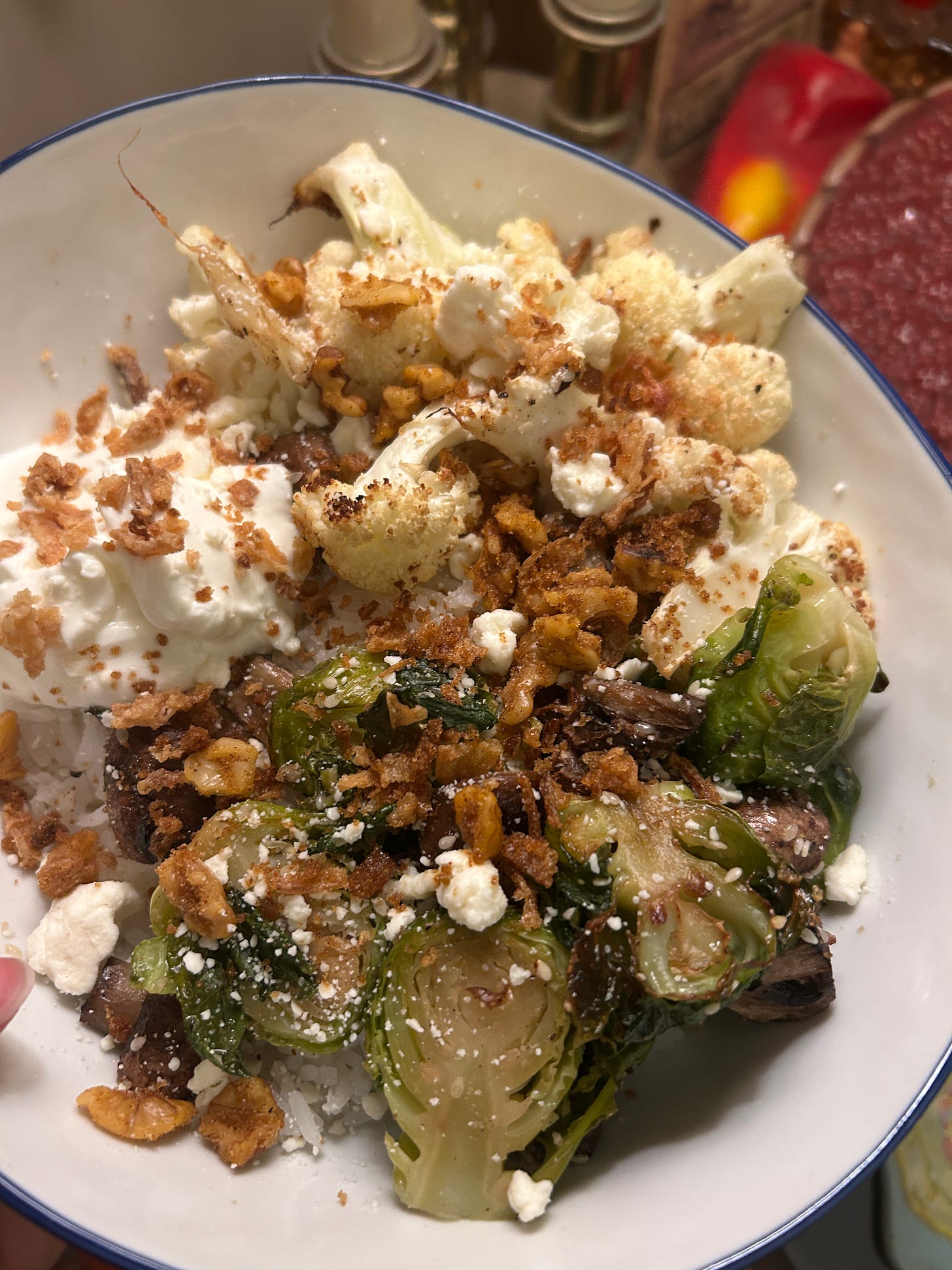 A nice little vegetarian dinner with rice, brussels sprouts, cauliflower, sour cream, and praline chili walnuts.